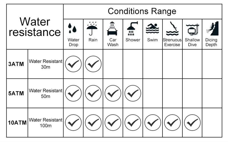 5. 3 ATM water resistant, perfect waterproof like washing hand/sweat/rain, but can not put into water or shower or swim.