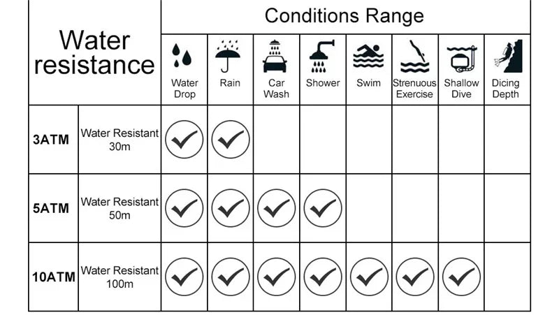 5. 3 ATM water resistant, perfect waterproof like washing hand/sweat/rain, but can not put into water or shower or swim.