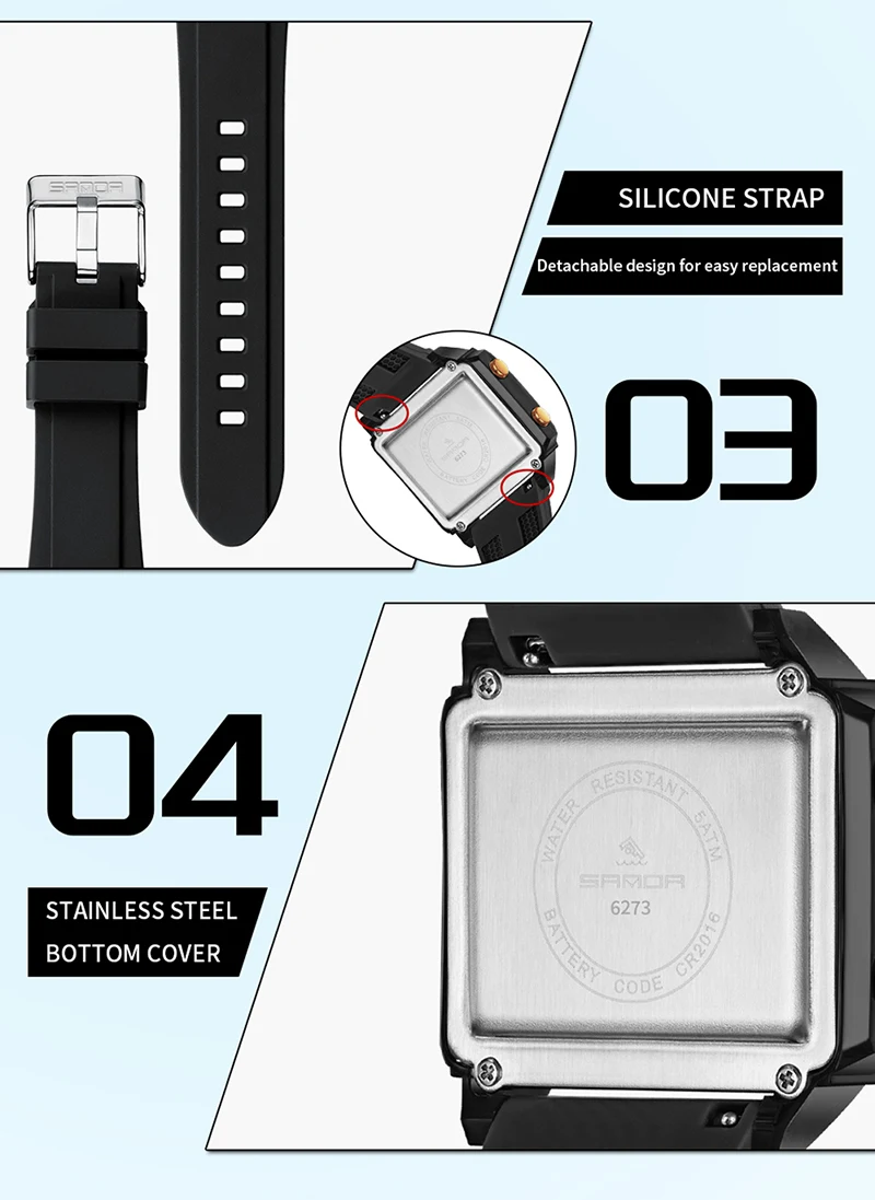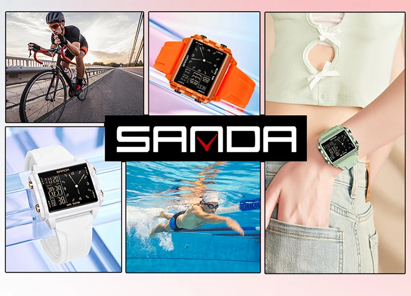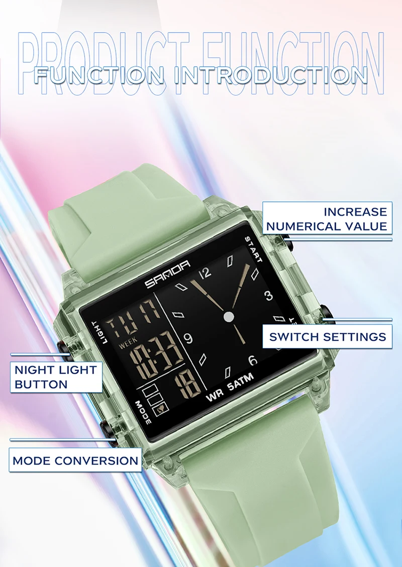 SANDA 6273 Wristwatch Square Dual Time Man Electron Analog Watch for Men Women Waterproof Count Down Timer Digital World Time
